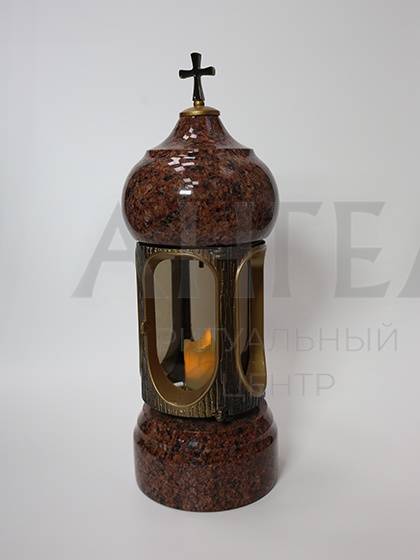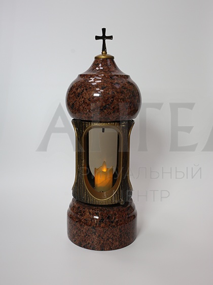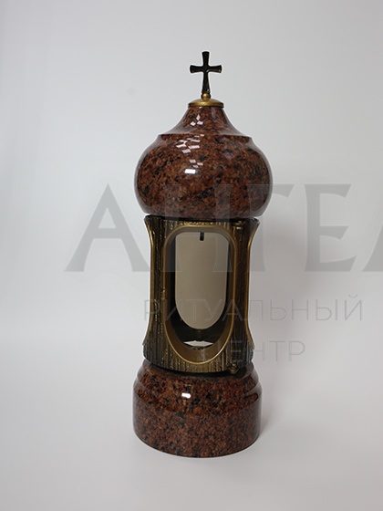 Высокая лампада из красного гранита с позолоченными элементами позволяет разместить свечу и надёжно защитить её от ветра.