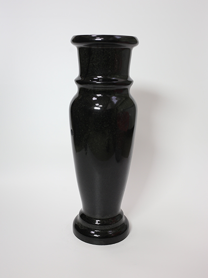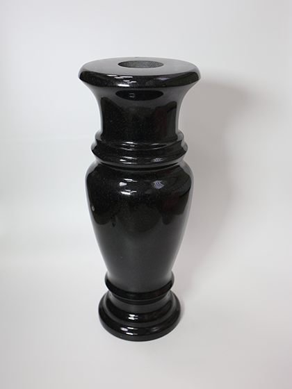 Стандартная ваза из черного гранита высотой 40 сантиметров. Сбоку имеется дренажное отверстие для слива воды.